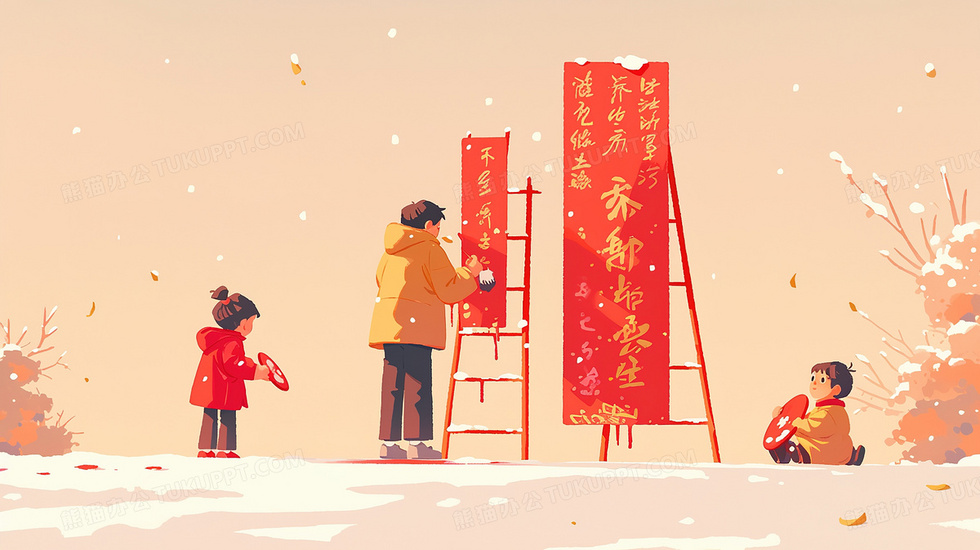 本作品内容为雪地写新春对联的一家人插画, 格式为 jpg, 大小2 MB, 图片尺寸为2912 x 1632, 源文件无水印, 欢迎使用熊猫办公。 如认为平台内容涉嫌侵权,可通过邮件:tousu@tukuppt.com提出书面通知,我们将及时处理。