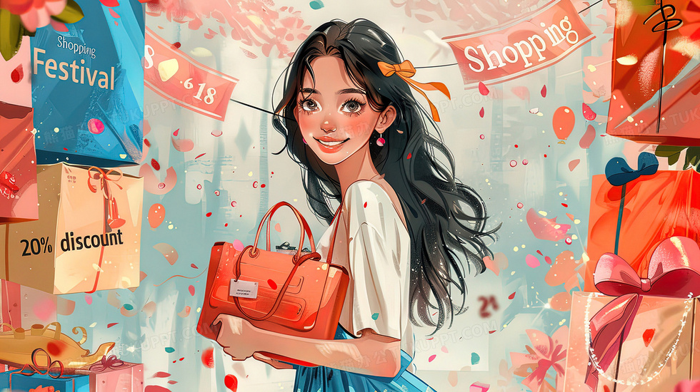 本作品内容为手绘618购物的女孩手拿包包插画, 格式为 jpg, 大小4 MB, 图片尺寸为2912 x 1632, 源文件无水印, 欢迎使用熊猫办公。 如认为平台内容涉嫌侵权,可通过邮件:tousu@tukuppt.com提出书面通知,我们将及时处理。