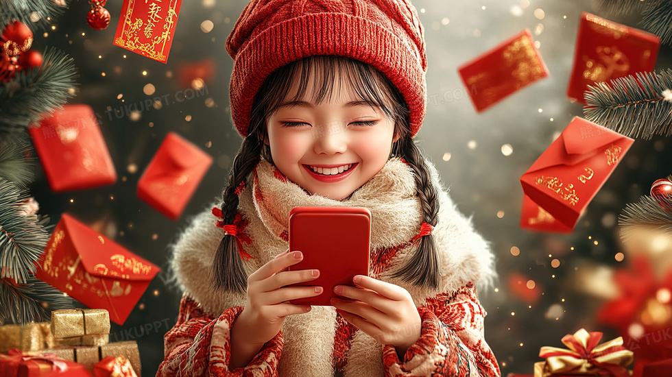 本作品内容为卡通女孩手机收红包的插画, 格式为 jpg, 大小3 MB, 图片尺寸为2912 x 1632, 源文件无水印, 欢迎使用熊猫办公。 如认为平台内容涉嫌侵权,可通过邮件:tousu@tukuppt.com提出书面通知,我们将及时处理。