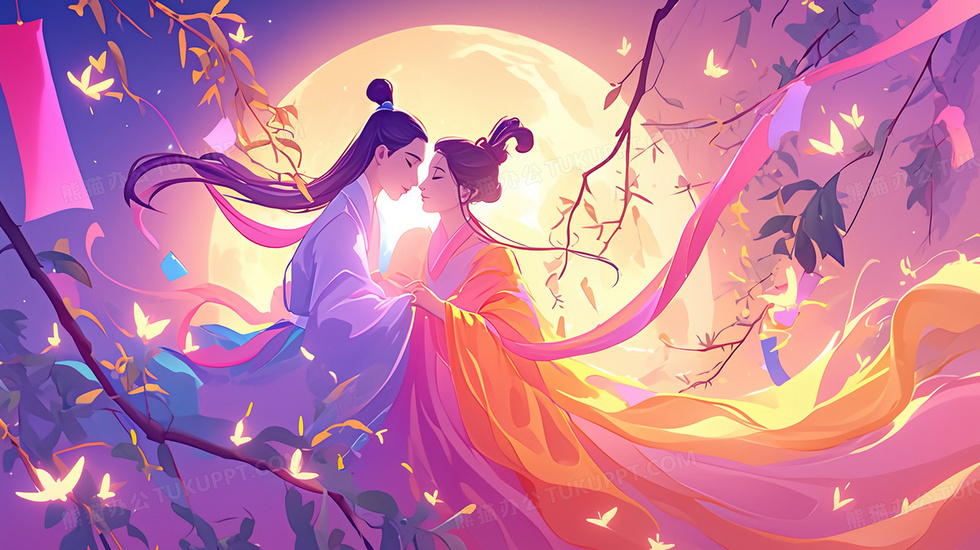 本作品内容为七夕月圆古风情侣约会浪漫插画, 格式为 jpg, 大小3 MB, 图片尺寸为2912 x 1632, 源文件无水印, 欢迎使用熊猫办公。 如认为平台内容涉嫌侵权,可通过邮件:tousu@tukuppt.com提出书面通知,我们将及时处理。