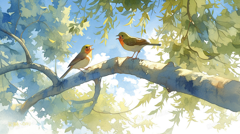 本作品内容为蓝天白云树枝上的两只鸟插画, 格式为 jpg, 大小3 MB, 图片尺寸为2912 x 1632, 源文件无水印, 欢迎使用熊猫办公。 如认为平台内容涉嫌侵权,可通过邮件:tousu@tukuppt.com提出书面通知,我们将及时处理。