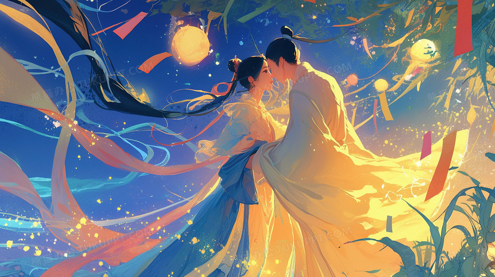 本作品内容为七夕赏月的古风情侣插画, 格式为 jpg, 大小3 MB, 图片尺寸为2912 x 1632, 源文件无水印, 欢迎使用熊猫办公。 如认为平台内容涉嫌侵权,可通过邮件:tousu@tukuppt.com提出书面通知,我们将及时处理。
