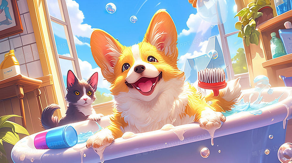 本作品内容为小狗在浴室洗澡宠物插画, 格式为 jpg, 大小3 MB, 图片尺寸为2912 x 1632, 源文件无水印, 欢迎使用熊猫办公。 如认为平台内容涉嫌侵权,可通过邮件:tousu@tukuppt.com提出书面通知,我们将及时处理。