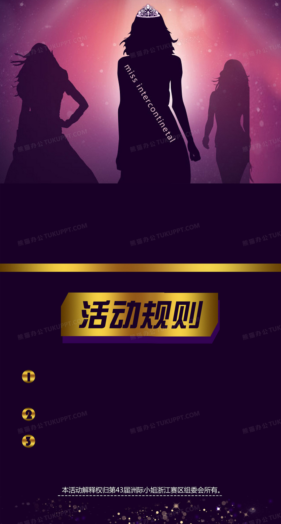 本作品内容为选美比赛海报背景素材, 格式为 psd, 图片尺寸为2500 x 4650, 作品中背景图片无需修改, 源文件无水印,可以直接使用, 欢迎使用熊猫办公。 如认为平台内容涉嫌侵权,可通过邮件:tousu@tukuppt.com提出书面通知,我们将及时处理。