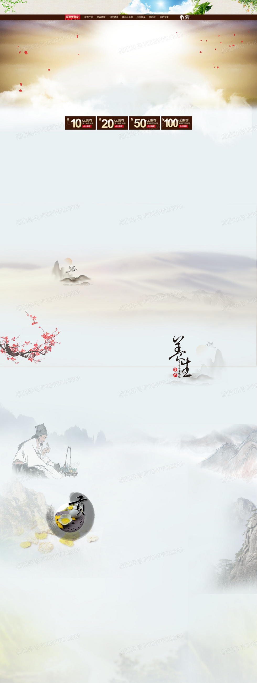 本作品内容为中国风中药茶叶店铺首页, 格式为 psd, 图片尺寸为1920 x 5088, 作品中背景图片无需修改, 源文件无水印,可以直接使用, 欢迎使用熊猫办公。 如认为平台内容涉嫌侵权,可通过邮件:tousu@tukuppt.com提出书面通知,我们将及时处理。
