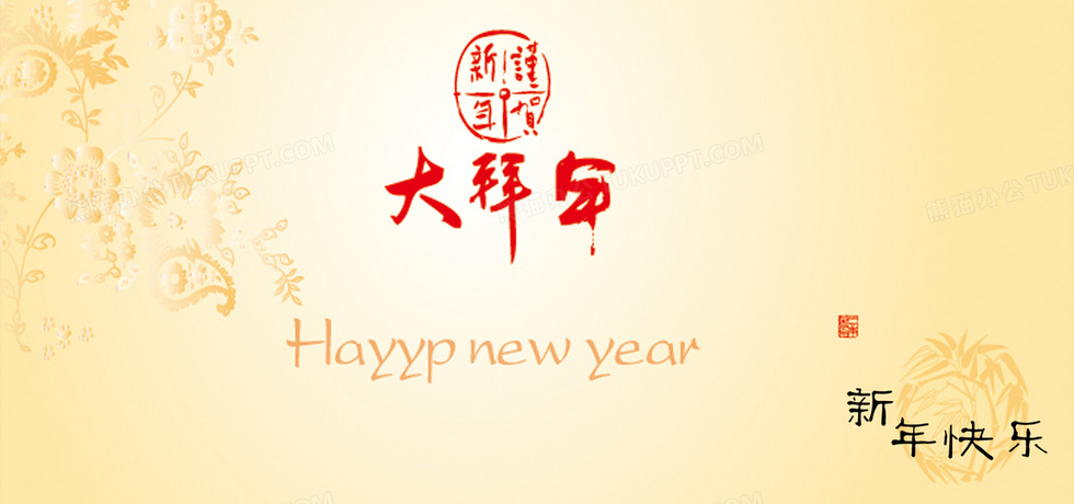 本作品内容为大拜年黄色喜庆背景, 格式为 psd, 图片尺寸为1920 x 900, 作品中背景图片无需修改, 源文件无水印,可以直接使用, 欢迎使用熊猫办公。 如认为平台内容涉嫌侵权,可通过邮件:tousu@tukuppt.com提出书面通知,我们将及时处理。