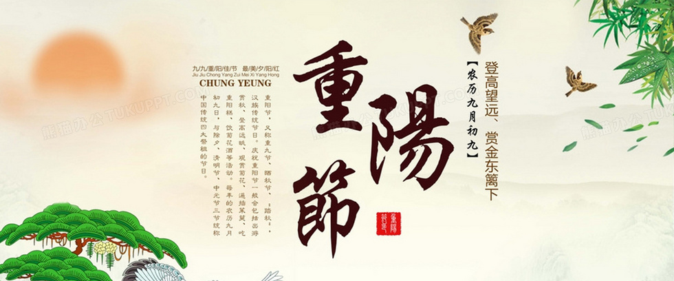 本作品内容为欢度重阳节背景图banner, 格式为 jpg, 图片尺寸为1920 x 800, 作品中背景图片无需修改, 源文件无水印,可以直接使用, 欢迎使用熊猫办公。 如认为平台内容涉嫌侵权,可通过邮件:tousu@tukuppt.com提出书面通知,我们将及时处理。