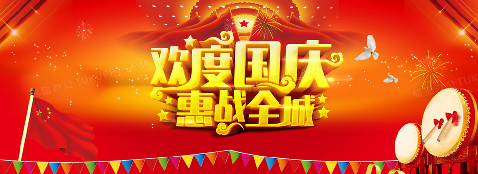 本作品内容为欢度国庆喜庆锣鼓吊旗背景, 格式为 psd, 图片尺寸为1920 x 700, 作品中背景图片无需修改, 源文件无水印,可以直接使用, 欢迎使用熊猫办公。 如认为平台内容涉嫌侵权,可通过邮件:tousu@tukuppt.com提出书面通知,我们将及时处理。