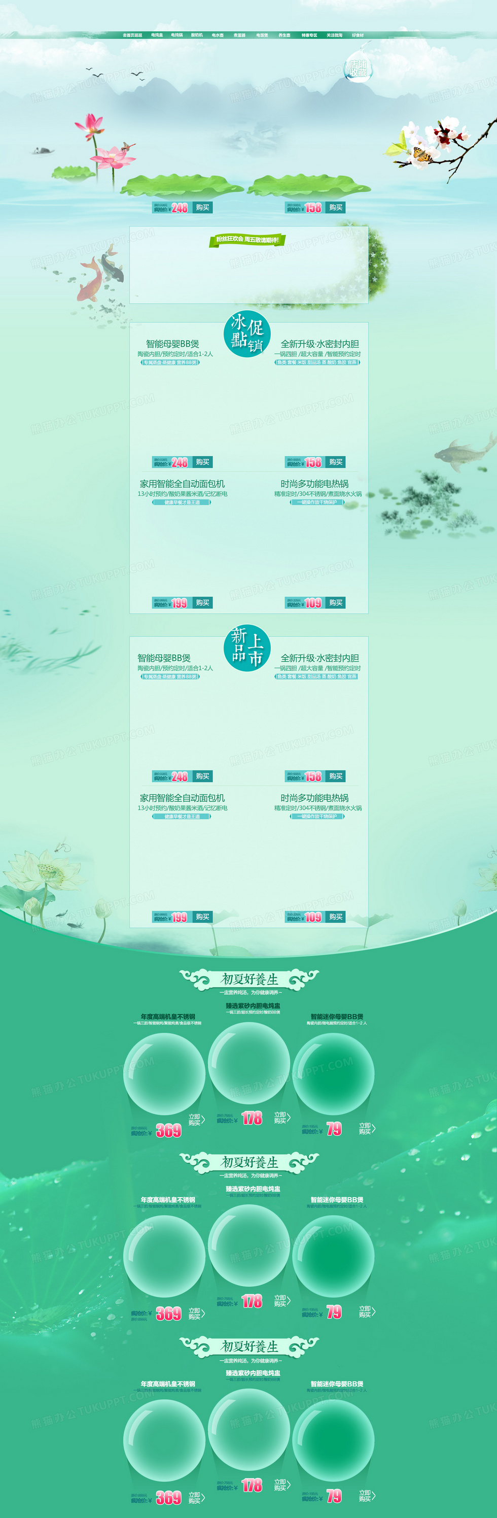 本作品内容为绿色中国风厨房电器店铺首页背景, 格式为 psd, 图片尺寸为1920 x 5861, 作品中背景图片无需修改, 源文件无水印,可以直接使用, 欢迎使用熊猫办公。 如认为平台内容涉嫌侵权,可通过邮件:tousu@tukuppt.com提出书面通知,我们将及时处理。