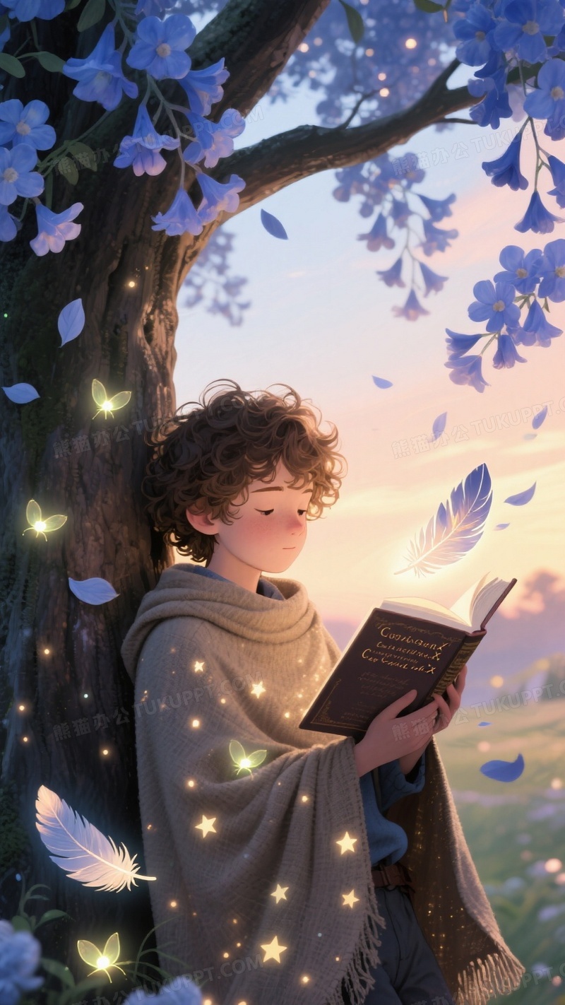 本作品内容为治愈系童话风格卷发少年倚靠开满蓝花楹的树干阅读, 格式为 jpg, 大小1 MB, 图片尺寸为936 x 1664, 源文件无水印, 欢迎使用熊猫办公。 如认为平台内容涉嫌侵权,可通过邮件:tousu@tukuppt.com提出书面通知,我们将及时处理。