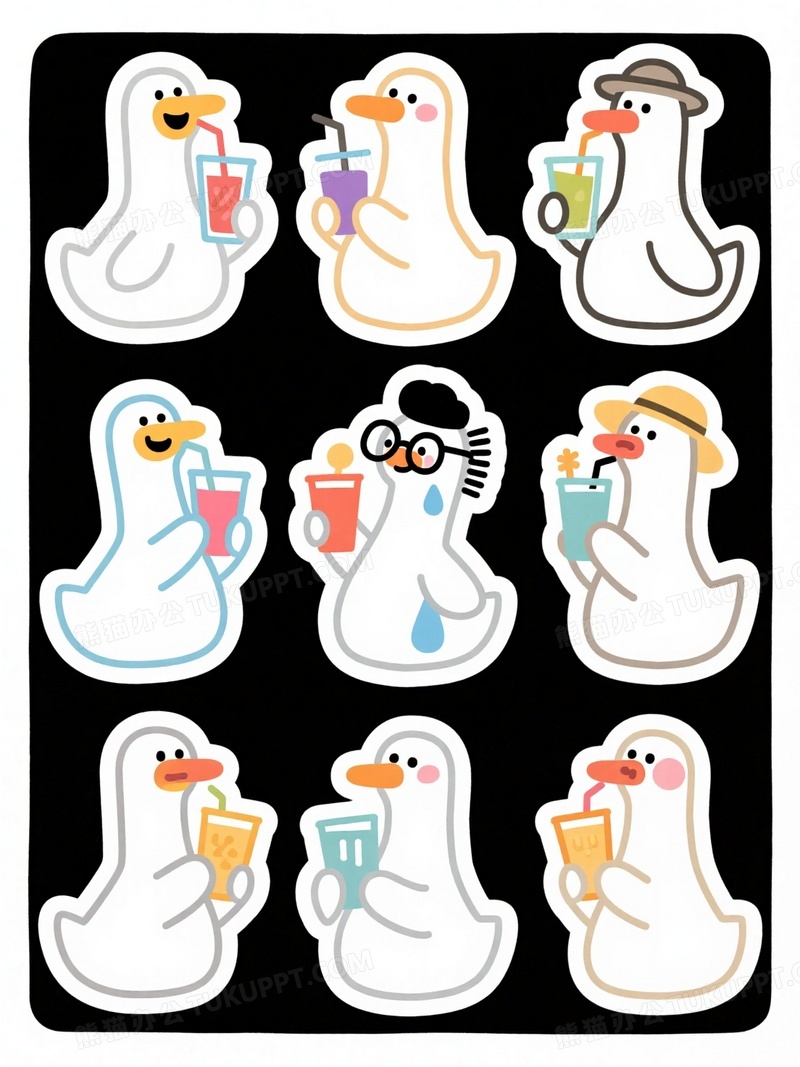 本作品内容为9张贴纸包含不同表情的鹅形象, 格式为 jpg, 大小1 MB, 图片尺寸为1104 x 1472, 源文件无水印, 欢迎使用熊猫办公。 如认为平台内容涉嫌侵权,可通过邮件:tousu@tukuppt.com提出书面通知,我们将及时处理。