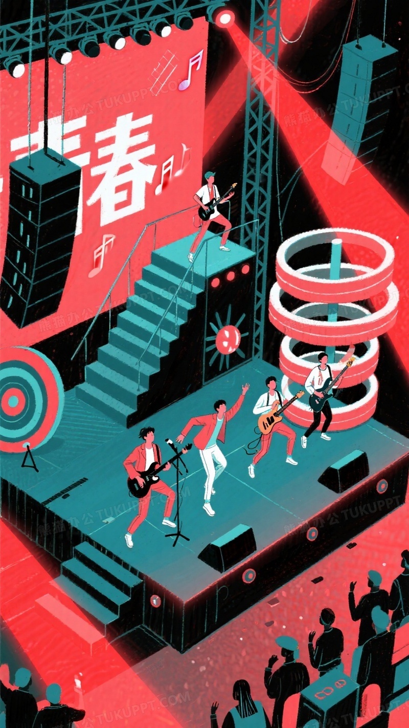 本作品内容为插画描绘青春乐队舞台表演, 格式为 jpg, 大小1 MB, 图片尺寸为936 x 1664, 源文件无水印, 欢迎使用熊猫办公。 如认为平台内容涉嫌侵权,可通过邮件:tousu@tukuppt.com提出书面通知,我们将及时处理。