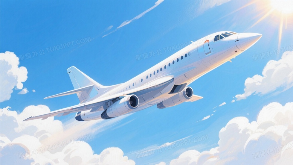 本作品内容为好看的飞机插画一架流线型的喷气式飞机在蓝天中飞行, 格式为 jpg, 大小1 MB, 图片尺寸为1664 x 936, 源文件无水印, 欢迎使用熊猫办公。 如认为平台内容涉嫌侵权,可通过邮件:tousu@tukuppt.com提出书面通知,我们将及时处理。