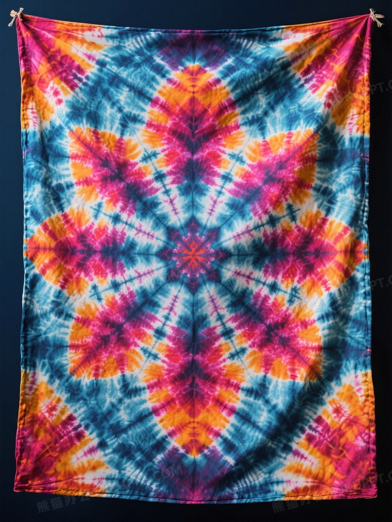 本作品内容为扎染艺术主题鲜艳一幅含有抽象艺术图案的扎染布艺, 格式为 jpg, 大小1 MB, 图片尺寸为1104 x 1472, 源文件无水印, 欢迎使用熊猫办公。 如认为平台内容涉嫌侵权,可通过邮件:tousu@tukuppt.com提出书面通知,我们将及时处理。