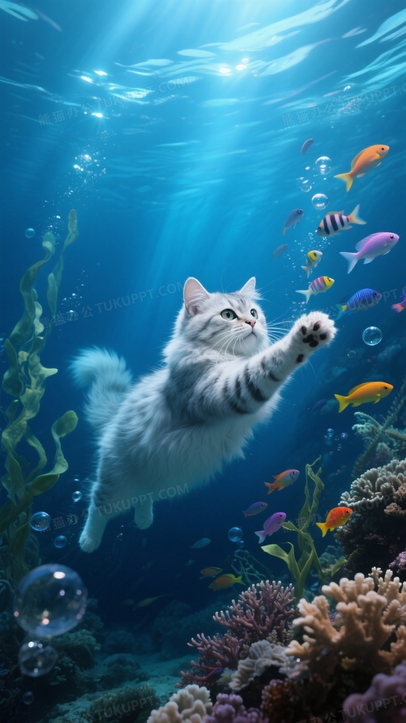 本作品内容为一只银渐层猫咪在神秘的海底世界中优雅游动, 格式为 jpg, 大小1 MB, 图片尺寸为936 x 1664, 源文件无水印, 欢迎使用熊猫办公。 如认为平台内容涉嫌侵权,可通过邮件:tousu@tukuppt.com提出书面通知,我们将及时处理。