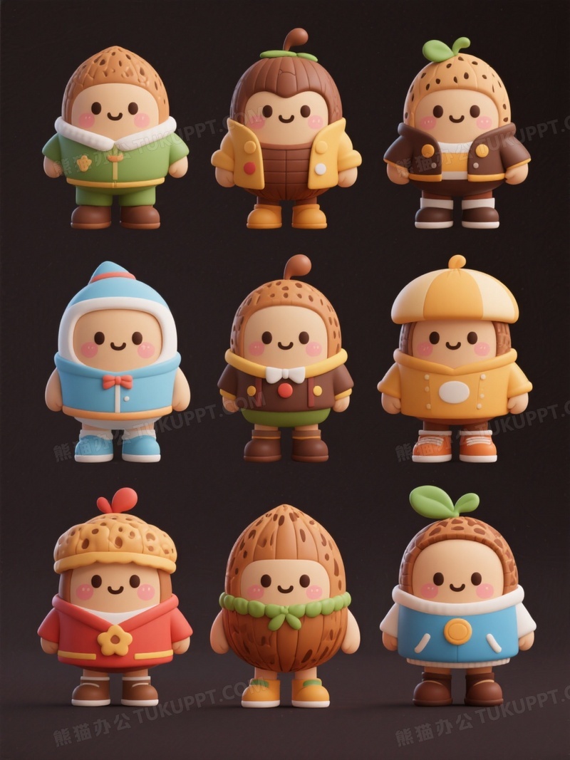 本作品内容为多种可爱的坚果卡通角色穿着不同的服装, 格式为 jpg, 大小1 MB, 图片尺寸为1104 x 1472, 源文件无水印, 欢迎使用熊猫办公。 如认为平台内容涉嫌侵权,可通过邮件:tousu@tukuppt.com提出书面通知,我们将及时处理。