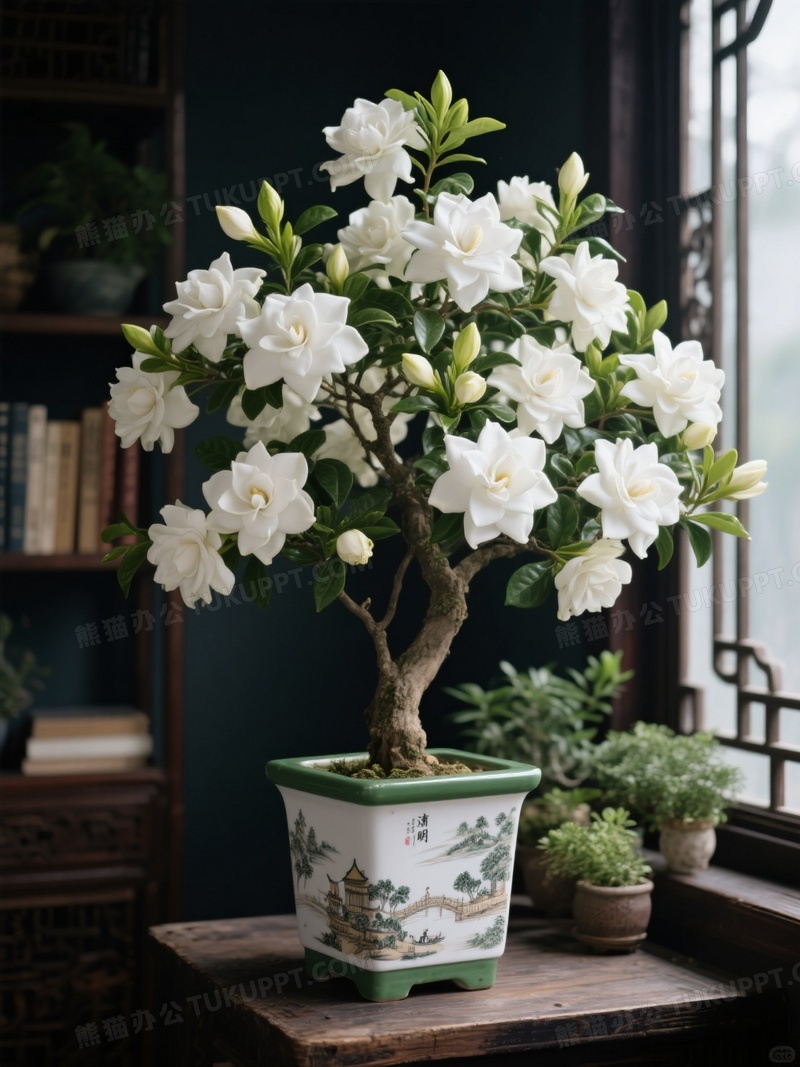 本作品内容为暗色古风室内背景图窗边有一棵开满超多超大重瓣白色桅子花老桩古风绿色色方形陶瓷盆栽特写镜头, 格式为 jpg, 大小1 MB, 图片尺寸为1104 x 1472, 源文件无水印, 欢迎使用熊猫办公。 如认为平台内容涉嫌侵权,可通过邮件:tousu@tukuppt.com提出书面通知,我们将及时处理。