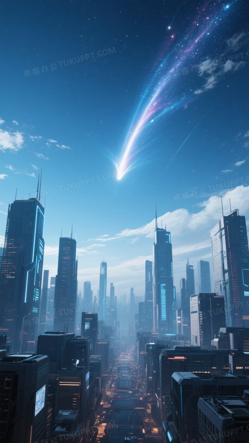 本作品内容为请你帮我生成一幅未来城市天空中划过流星的场面, 格式为 jpg, 大小1 MB, 图片尺寸为936 x 1664, 源文件无水印, 欢迎使用熊猫办公。 如认为平台内容涉嫌侵权,可通过邮件:tousu@tukuppt.com提出书面通知,我们将及时处理。