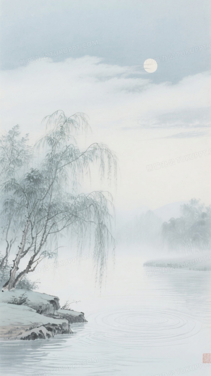 本作品内容为水墨风格杨柳垂岸清晨微风吹拂水面, 格式为 jpg, 大小1 MB, 图片尺寸为936 x 1664, 源文件无水印, 欢迎使用熊猫办公。 如认为平台内容涉嫌侵权,可通过邮件:tousu@tukuppt.com提出书面通知,我们将及时处理。