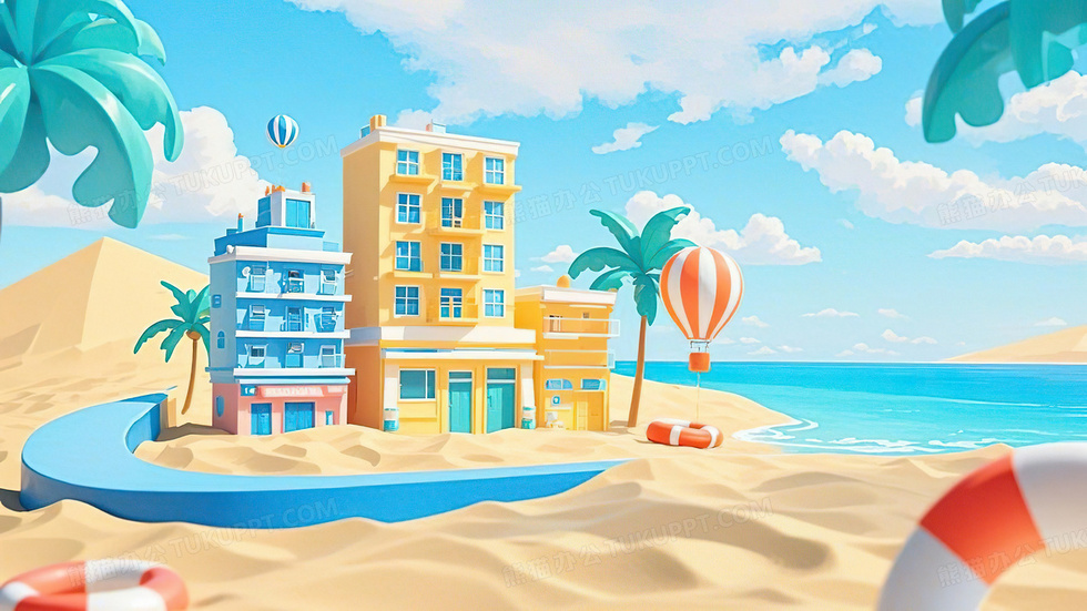 本作品内容为沙滩海边夏天3D清凉夏季插画, 格式为 jpg, 大小5 MB, 图片尺寸为3072 x 1728, 源文件无水印, 欢迎使用熊猫办公。 如认为平台内容涉嫌侵权,可通过邮件:tousu@tukuppt.com提出书面通知,我们将及时处理。