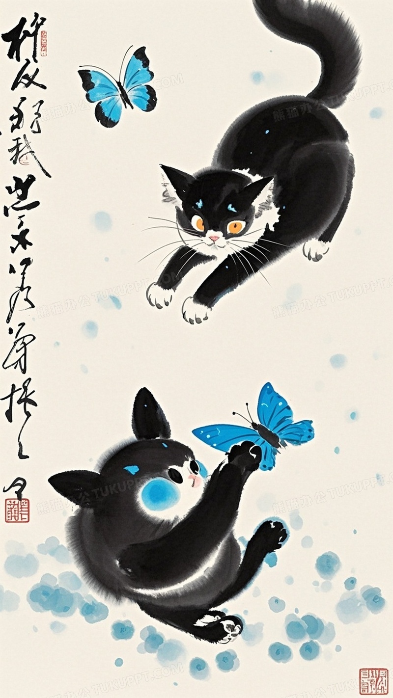 本作品内容为一个Q版可爱的黑猫正在追蝴蝶, 格式为 jpg, 大小1 MB, 图片尺寸为1152 x 2048, 源文件无水印, 欢迎使用熊猫办公。 如认为平台内容涉嫌侵权,可通过邮件:tousu@tukuppt.com提出书面通知,我们将及时处理。