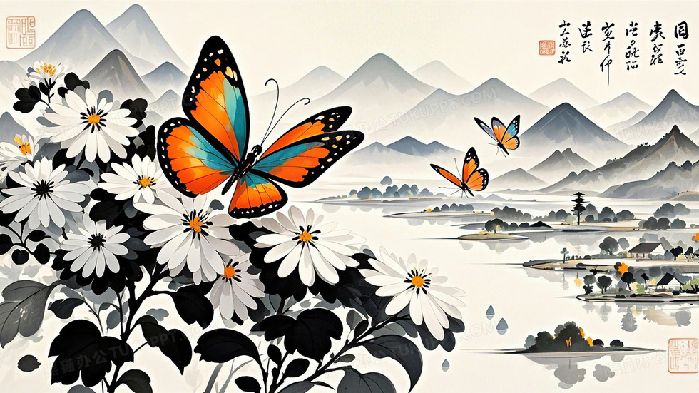 本作品内容为中国风水墨风蝴蝶植物插画, 格式为 jpg, 大小5 MB, 图片尺寸为3072 x 1728, 源文件无水印, 欢迎使用熊猫办公。 如认为平台内容涉嫌侵权,可通过邮件:tousu@tukuppt.com提出书面通知,我们将及时处理。