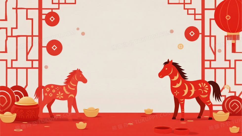 本作品内容为中国新年红色剪纸马喜庆背景, 格式为 jpg, 大小4 MB, 图片尺寸为3328 x 1872, 作品中背景图片无需修改, 源文件无水印,可以直接使用, 欢迎使用熊猫办公。 如认为平台内容涉嫌侵权,可通过邮件:tousu@tukuppt.com提出书面通知,我们将及时处理。