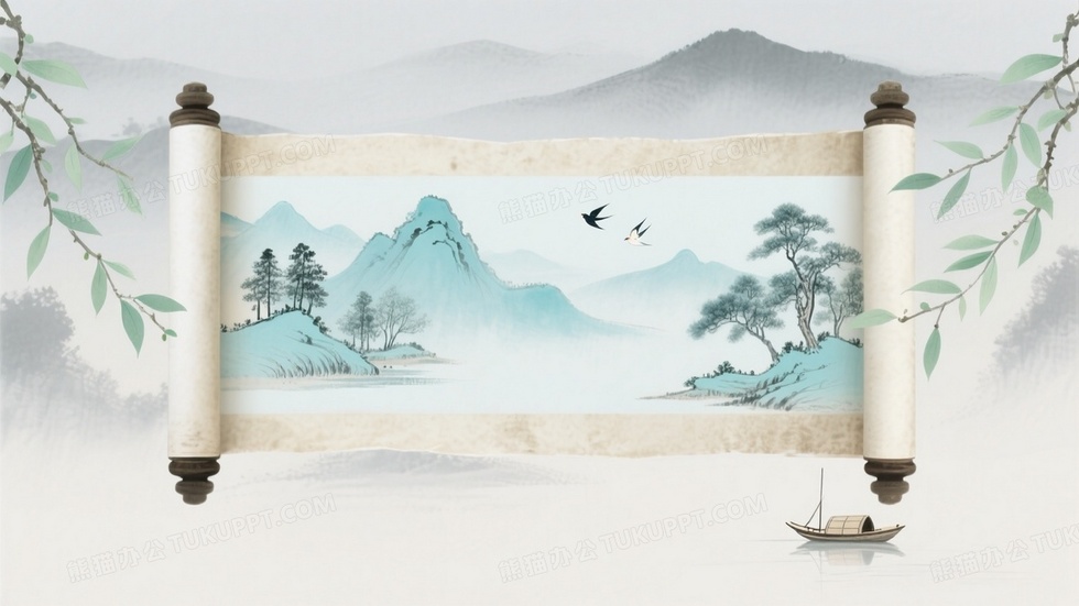 本作品内容为国风淡雅水墨画风主体有展开的卷轴, 格式为 jpg, 大小1 MB, 图片尺寸为1664 x 936, 作品中背景图片无需修改, 源文件无水印,可以直接使用, 欢迎使用熊猫办公。 如认为平台内容涉嫌侵权,可通过邮件:tousu@tukuppt.com提出书面通知,我们将及时处理。