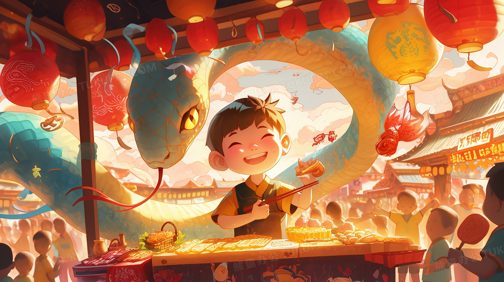 本作品内容为蛇年新年元旦集市售卖灯笼男孩与卡通蛇插画, 格式为 jpg, 大小3 MB, 图片尺寸为2912 x 1632, 源文件无水印, 欢迎使用熊猫办公。 如认为平台内容涉嫌侵权,可通过邮件:tousu@tukuppt.com提出书面通知,我们将及时处理。