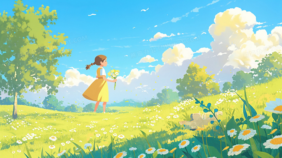本作品内容为蔚蓝天空草地卡通女孩唯美风景插画, 格式为 jpg, 大小3 MB, 图片尺寸为2912 x 1632, 源文件无水印, 欢迎使用熊猫办公。 如认为平台内容涉嫌侵权,可通过邮件:tousu@tukuppt.com提出书面通知,我们将及时处理。