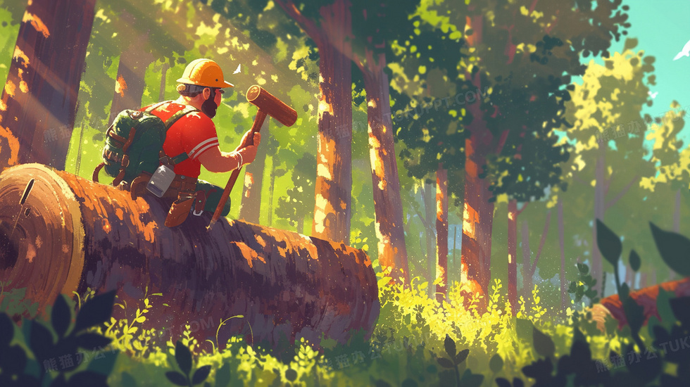 本作品内容为绿色森林中的伐木工人插画, 格式为 jpg, 大小3 MB, 图片尺寸为2912 x 1632, 源文件无水印, 欢迎使用熊猫办公。 如认为平台内容涉嫌侵权,可通过邮件:tousu@tukuppt.com提出书面通知,我们将及时处理。