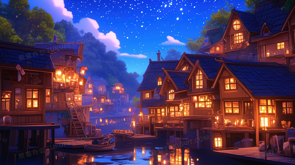 本作品内容为乡村夜晚房屋灯光明亮插画, 格式为 jpg, 大小3 MB, 图片尺寸为2912 x 1632, 源文件无水印, 欢迎使用熊猫办公。 如认为平台内容涉嫌侵权,可通过邮件:tousu@tukuppt.com提出书面通知,我们将及时处理。