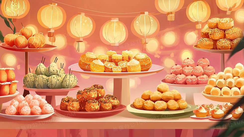 本作品内容为新年春节糕点美食灯笼插画, 格式为 jpg, 大小3 MB, 图片尺寸为2912 x 1632, 源文件无水印, 欢迎使用熊猫办公。 如认为平台内容涉嫌侵权,可通过邮件:tousu@tukuppt.com提出书面通知,我们将及时处理。
