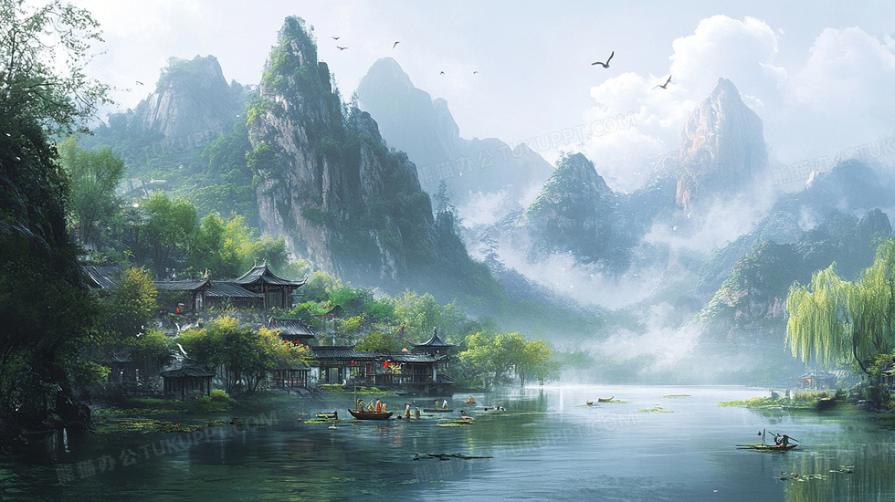 本作品内容为山水中国风四季唯美风景插画, 格式为 jpg, 大小4 MB, 图片尺寸为2912 x 1632, 源文件无水印, 欢迎使用熊猫办公。 如认为平台内容涉嫌侵权,可通过邮件:tousu@tukuppt.com提出书面通知,我们将及时处理。