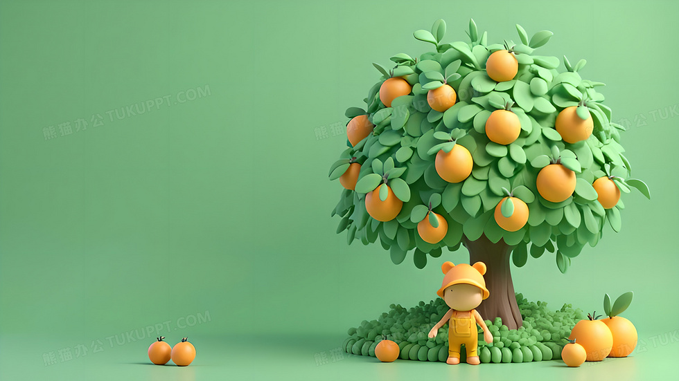 本作品内容为绿色3D橘子水果采摘背景, 格式为 jpg, 大小6 MB, 图片尺寸为3072 x 1728, 作品中背景图片无需修改, 源文件无水印,可以直接使用, 欢迎使用熊猫办公。 如认为平台内容涉嫌侵权,可通过邮件:tousu@tukuppt.com提出书面通知,我们将及时处理。
