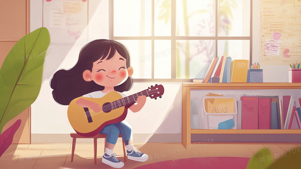 本作品内容为课外辅导班教室内练习弹吉他的可爱女孩插画, 格式为 jpg, 大小2 MB, 图片尺寸为2912 x 1632, 源文件无水印, 欢迎使用熊猫办公。 如认为平台内容涉嫌侵权,可通过邮件:tousu@tukuppt.com提出书面通知,我们将及时处理。