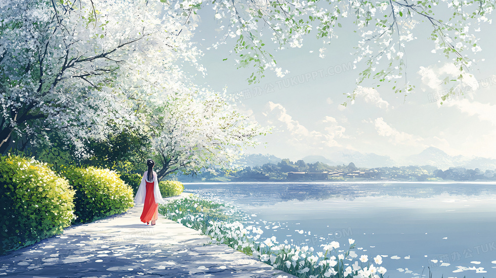本作品内容为春天湖边漫步的古装女孩插画, 格式为 jpg, 大小7 MB, 图片尺寸为2912 x 1632, 源文件无水印, 欢迎使用熊猫办公。 如认为平台内容涉嫌侵权,可通过邮件:tousu@tukuppt.com提出书面通知,我们将及时处理。