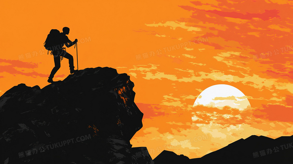 本作品内容为剪影风日出日落登山者插画, 格式为 jpg, 大小2 MB, 图片尺寸为2912 x 1632, 源文件无水印, 欢迎使用熊猫办公。 如认为平台内容涉嫌侵权,可通过邮件:tousu@tukuppt.com提出书面通知,我们将及时处理。