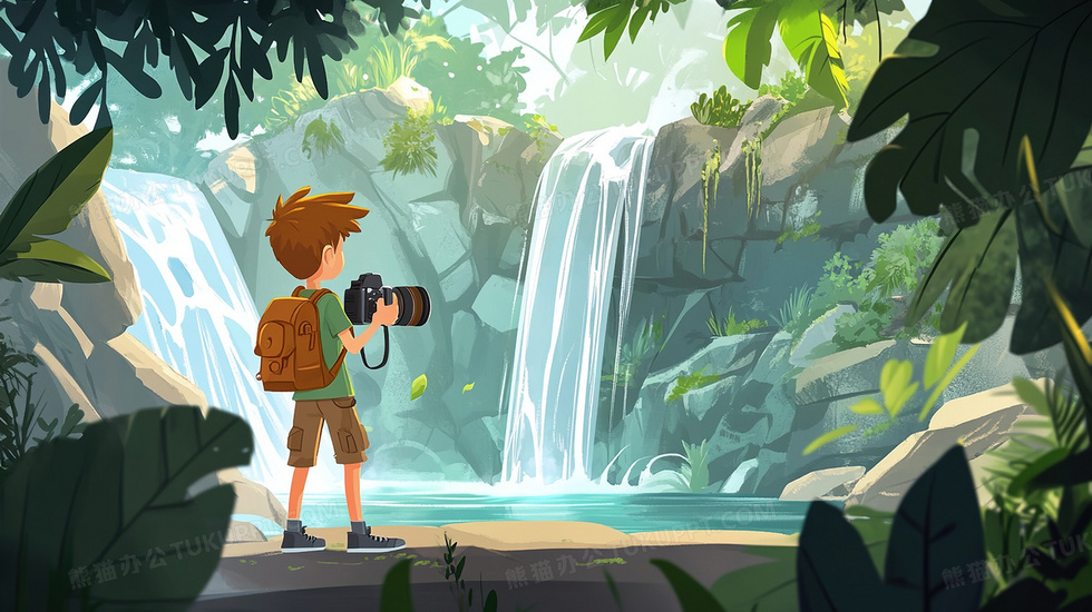 本作品内容为美丽的瀑布前男孩拿着相机拍摄风景插画, 格式为 jpg, 大小3 MB, 图片尺寸为2912 x 1632, 源文件无水印, 欢迎使用熊猫办公。 如认为平台内容涉嫌侵权,可通过邮件:tousu@tukuppt.com提出书面通知,我们将及时处理。