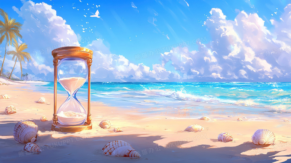 本作品内容为沙滩海浪沙漏唯美壁纸插画, 格式为 jpg, 大小3 MB, 图片尺寸为2912 x 1632, 源文件无水印, 欢迎使用熊猫办公。 如认为平台内容涉嫌侵权,可通过邮件:tousu@tukuppt.com提出书面通知,我们将及时处理。