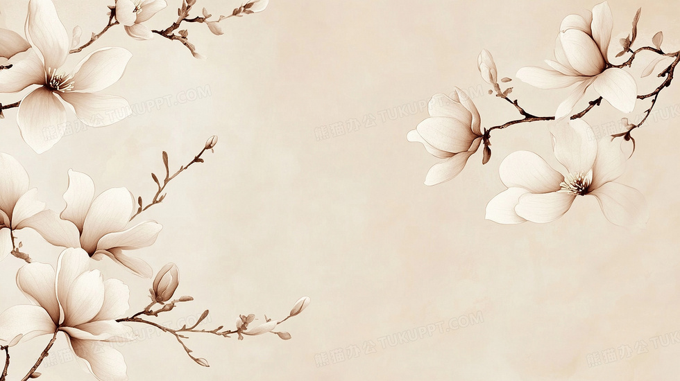 本作品内容为中国风水彩白玉兰植物背景, 格式为 jpg, 大小3 MB, 图片尺寸为2912 x 1632, 作品中背景图片无需修改, 源文件无水印,可以直接使用, 欢迎使用熊猫办公。 如认为平台内容涉嫌侵权,可通过邮件:tousu@tukuppt.com提出书面通知,我们将及时处理。