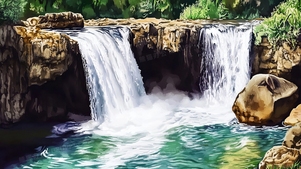 本作品内容为自然风景户外美丽的瀑布插画, 格式为 jpg, 大小4 MB, 图片尺寸为2912 x 1632, 源文件无水印, 欢迎使用熊猫办公。 如认为平台内容涉嫌侵权,可通过邮件:tousu@tukuppt.com提出书面通知,我们将及时处理。