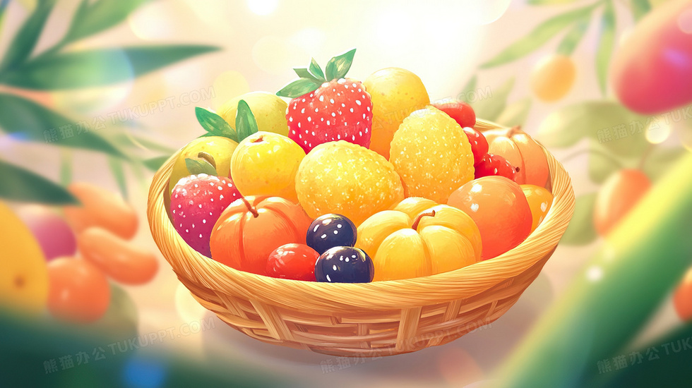 本作品内容为卡通风放置在竹篮里的水果插画, 格式为 jpg, 大小3 MB, 图片尺寸为2912 x 1632, 源文件无水印, 欢迎使用熊猫办公。 如认为平台内容涉嫌侵权,可通过邮件:tousu@tukuppt.com提出书面通知,我们将及时处理。