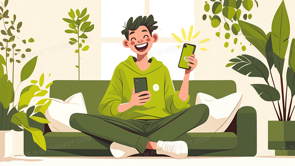 本作品内容为室内绿植围绕坐在沙发玩手机卡通男孩插画, 格式为 jpg, 大小2 MB, 图片尺寸为2912 x 1632, 源文件无水印, 欢迎使用熊猫办公。 如认为平台内容涉嫌侵权,可通过邮件:tousu@tukuppt.com提出书面通知,我们将及时处理。