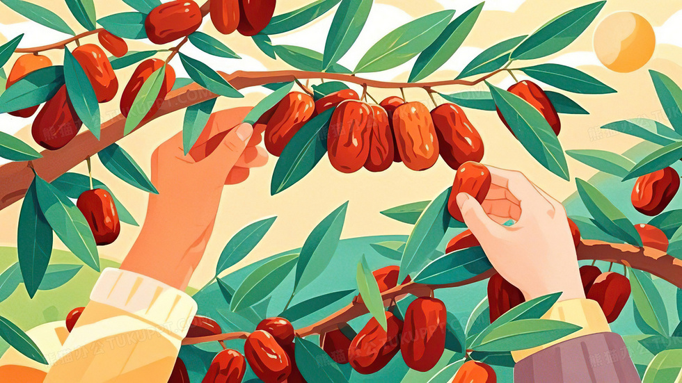 本作品内容为红枣采摘农田农村农副产品插画, 格式为 jpg, 大小4 MB, 图片尺寸为3072 x 1728, 源文件无水印, 欢迎使用熊猫办公。 如认为平台内容涉嫌侵权,可通过邮件:tousu@tukuppt.com提出书面通知,我们将及时处理。