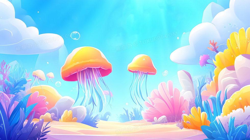 本作品内容为卡通海洋生物背景, 格式为 jpg, 大小3 MB, 图片尺寸为2912 x 1632, 作品中背景图片无需修改, 源文件无水印,可以直接使用, 欢迎使用熊猫办公。 如认为平台内容涉嫌侵权,可通过邮件:tousu@tukuppt.com提出书面通知,我们将及时处理。