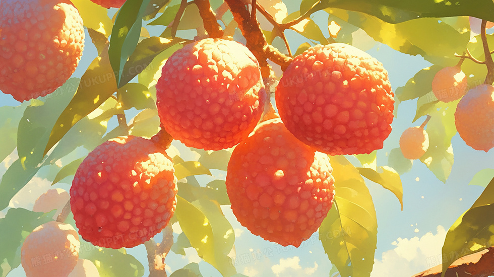 本作品内容为果园新鲜水果荔枝特写插画, 格式为 jpg, 大小3 MB, 图片尺寸为2912 x 1632, 源文件无水印, 欢迎使用熊猫办公。 如认为平台内容涉嫌侵权,可通过邮件:tousu@tukuppt.com提出书面通知,我们将及时处理。