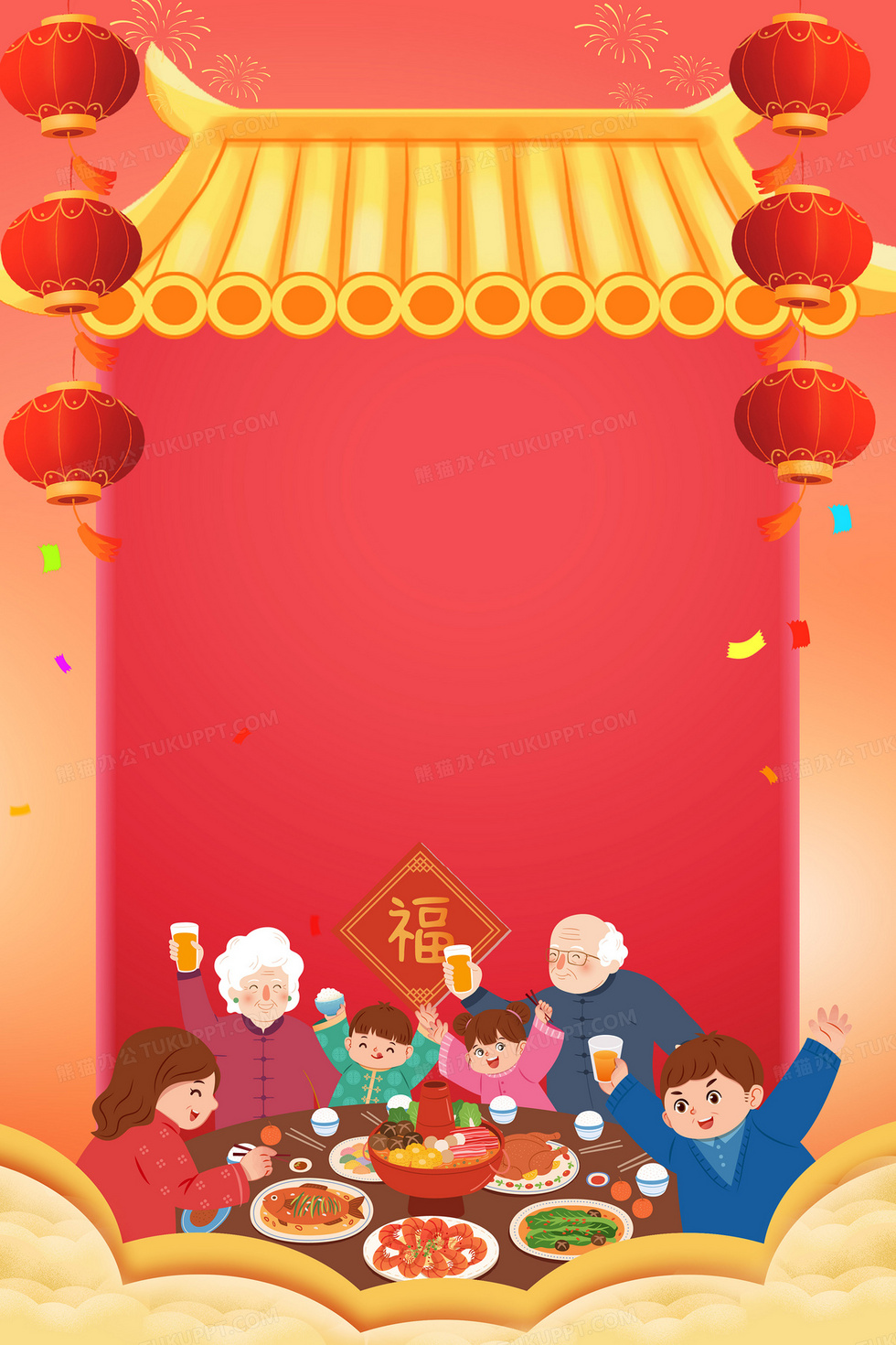 本作品内容为除夕团圆饭创意背景, 格式为 psd, 大小27 MB, 图片尺寸为3543 x 5315, 作品中背景图片无需修改, 源文件无水印,可以直接使用, 欢迎使用熊猫办公。 如认为平台内容涉嫌侵权,可通过邮件:tousu@tukuppt.com提出书面通知,我们将及时处理。