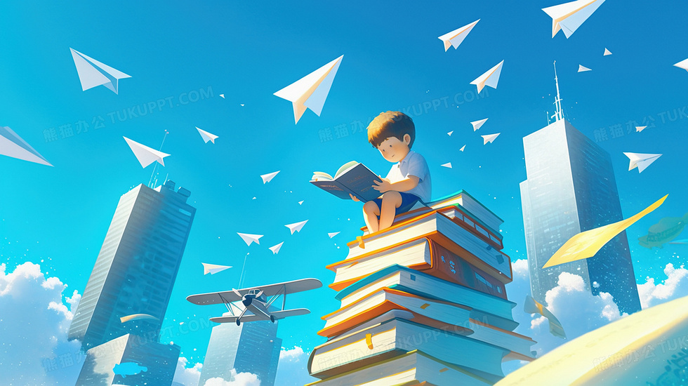 本作品内容为梦幻男孩坐在书堆上看书阅读纸飞机插画, 格式为 jpg, 大小3 MB, 图片尺寸为2912 x 1632, 源文件无水印, 欢迎使用熊猫办公。 如认为平台内容涉嫌侵权,可通过邮件:tousu@tukuppt.com提出书面通知,我们将及时处理。