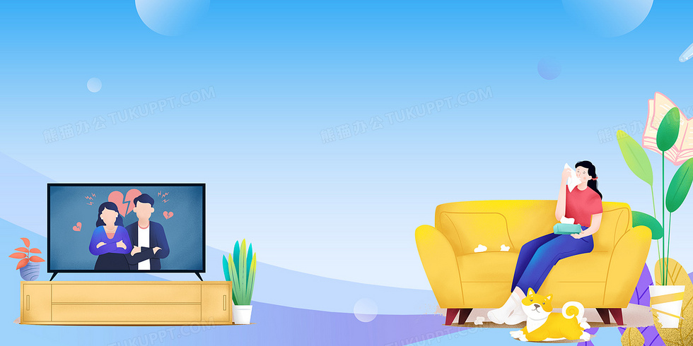 本作品内容为蓝色扁平卡通风看电视插画背景, 格式为 psd, 大小37 MB, 图片尺寸为7087 x 3543, 作品中背景图片无需修改, 源文件无水印,可以直接使用, 欢迎使用熊猫办公。 如认为平台内容涉嫌侵权,可通过邮件:tousu@tukuppt.com提出书面通知,我们将及时处理。